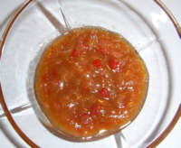500 gr. rabarber 2 stk. rødløg 4-5 sp.sk. eddike ¾ dl. vand 5 dl. sukker 1½ tsk. ingefær 1 tsk. karry 2 tsk. salt 2 hakkede røde chili 6 tørrede fint hakkede abrikoser